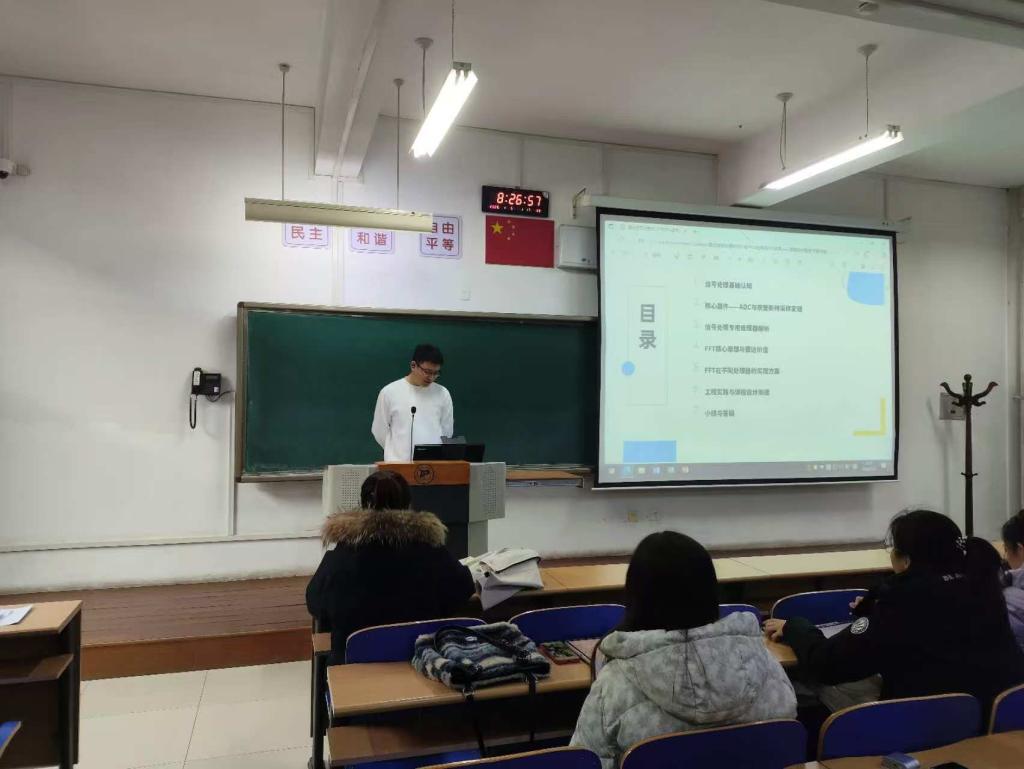 2026年1月5日,yl6776永利集团在金川校区教C204,分别面向电子信息工程23级本科生、通信工程23级本科生举办关于信号处理工程应用的讲座,主讲人为内蒙古方向图科技有限公司的硬件工程师王海洋,讲座题目为《雷达信号处理中DSP与FPGA应用及FFT实现》。主讲人从信号处理基础认知、采样定理与芯片、信号处理器件、FFT原理、信号处理工程实现方案等方面,结合实际雷达系统,全面讲解了信号处理基本理论方法及其工程实现,介绍了ADC、DSP、FPGA等器件的特点和应用方法。讲座内容兼顾理论深度和工程应用,引起了在场学生的广泛兴趣。