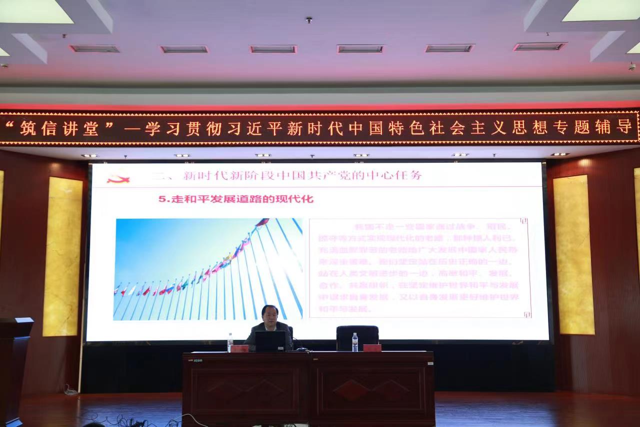 为深入推进学习贯彻习近平新时代中国特色社会主义思想主题教育,5月4日下午,yl6776永利集团开展“筑信讲堂”-学习贯彻习近平新时代中国特色社会主义思想主题教育专题辅导,邀请马克思主义学院院长布和朝鲁教授作题为《新时代新征程中国共产党使命任务》的辅导讲座。学院党委书记乌迪主持,师生党员180余人参加。