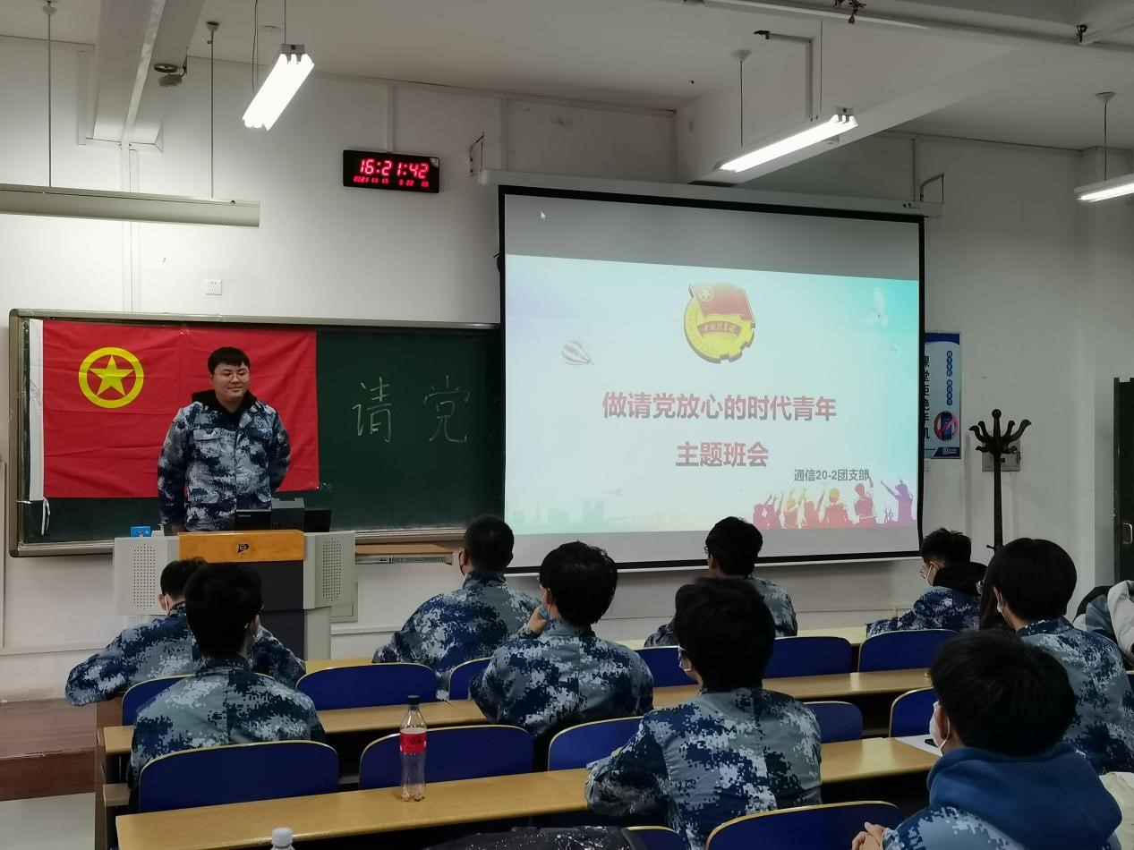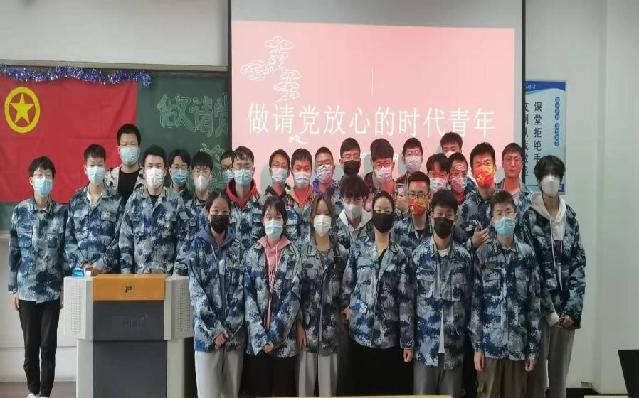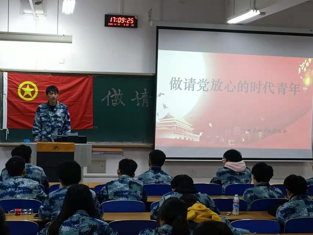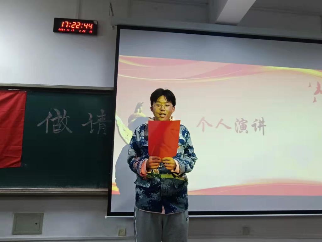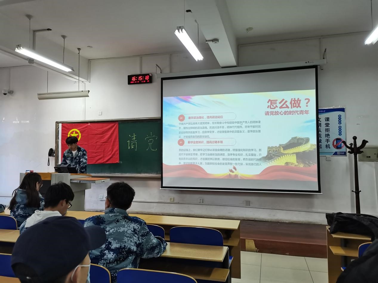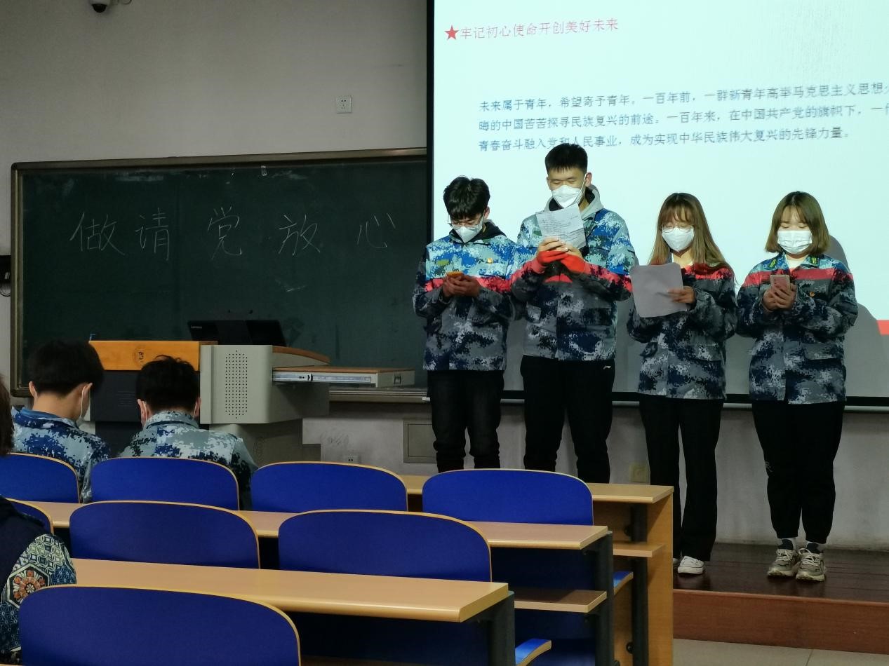 各班在主题班团会上齐唱团歌、共同观看党的发展史,随后同学们结合自身实际,对于新时代青年肩负的时代责任与使命展开深入思考,并以演讲的形式表达了自身看法,并发出了对自我的审视。有的班级朗诵《做请党放心的时代青年》,他们用清脆、洪亮的声音展示了对党的歌颂,赞美,并进行党史竞赛问答环节,充分展示了同学们做“请党放心,强国由我”的时代青年的决心和对加入党组织的向往。