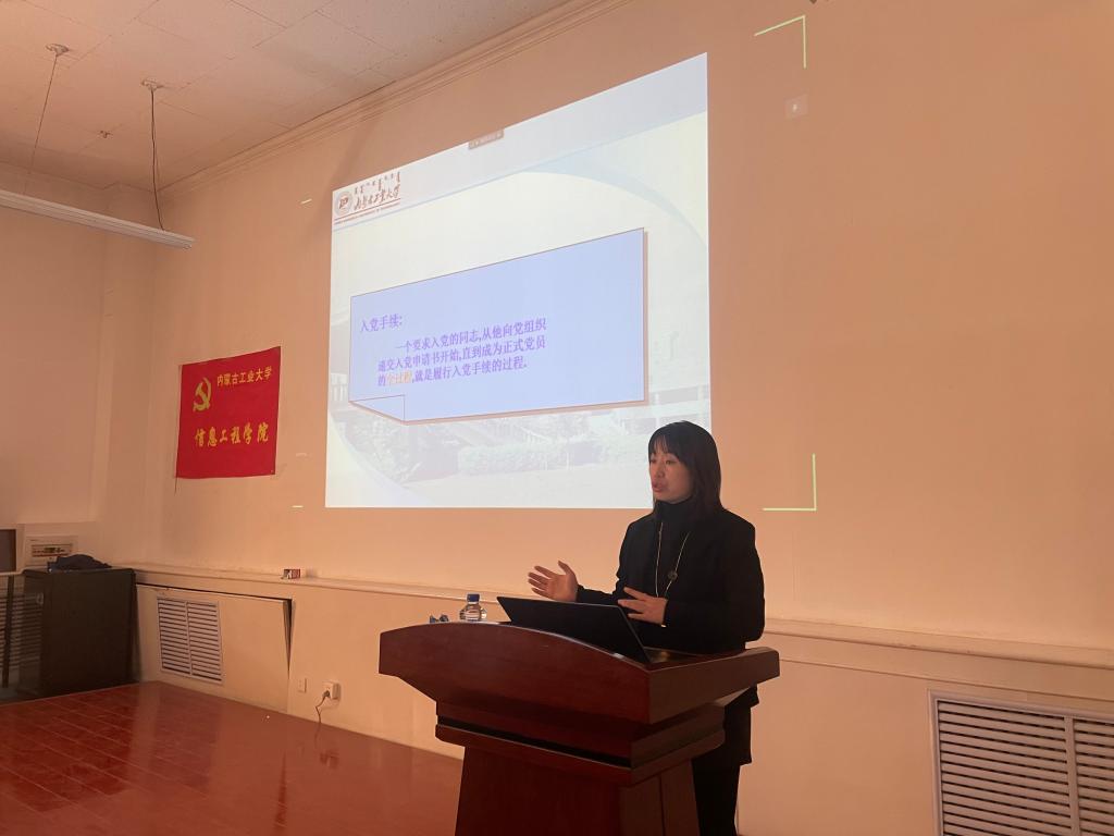 学院党委委员许霞老师对大学生入党流程做了深入介绍,告诉同学们入党是一个人的终身信仰和政治追求,要不断端正入党动机,不忘入党初心,牢记合格党员的标准,提升党性修养,坚守理想信念。党委书记王彩玲老师重点讲了习近平总书记“七一”重要讲话精神,让我们明白身为青年学生的我们,应以前辈楷模为榜样,听党话、跟党走、勇于拼搏、攻坚克难,为祖国的繁荣昌盛奉献自己的力量;校外辅导员翟鹤,结合自身实际对党员的义务和权利进行详细讲解,让同学们明白党员的义务和权利是一个相互联系、不可分割的整体,是互为条件、互相促进的关系;学院院长李春明老师以及院党委副书记、副院长王金彪老师分别从不同角度讲解了十九届六中全会精神,鼓励我们在战鼓催征中开拓进取,在时代潮流中奋勇搏击,保持奋斗之姿、聚起奋斗之力,创造新辉煌,实现新跨越,争做新时代青年。