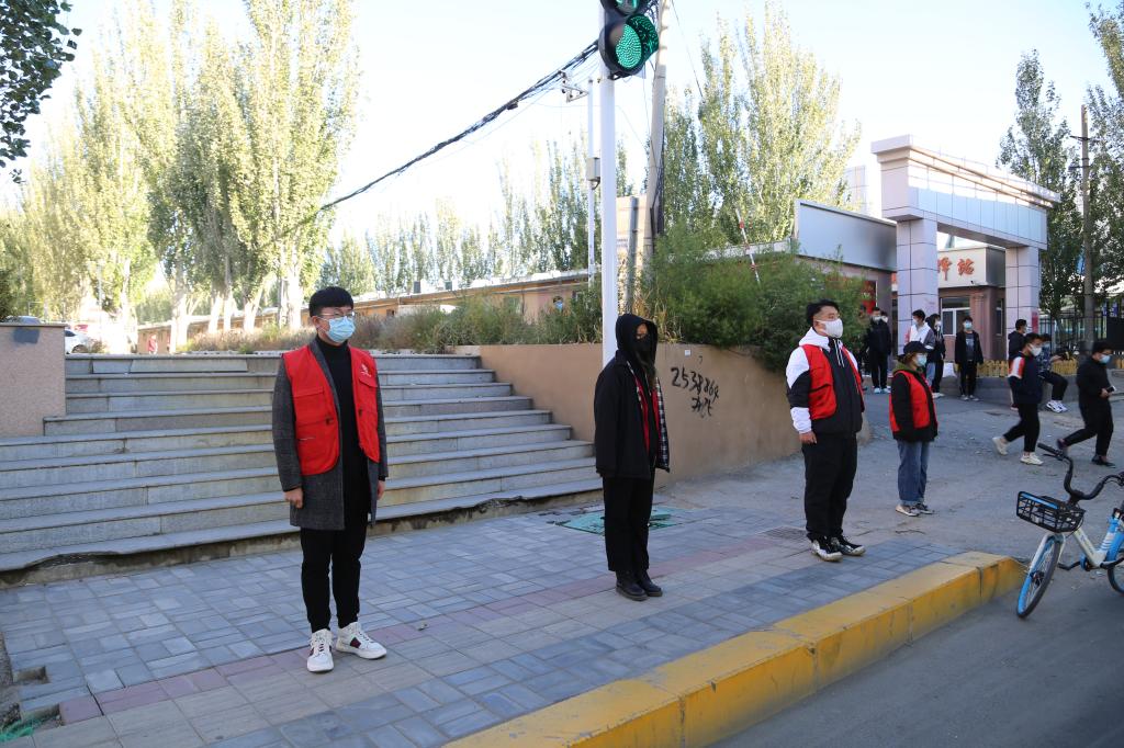 早上七点四十,志愿者陆续到岗,学校保安先对他们进行体温测量、绿码查看,然后要求所有志愿者戴好口罩、穿好马甲。在党员同志的指导下,志愿者们迅速到指定岗位进入工作状态。全副武装,一身身红马甲、一个个卡口上,忙碌的身影,青春飞扬。让我们看到新时代大学生最美的模样,一个个逆风而行的身影,构成了确保人民生命安全和身体健康的“钢铁长城”。