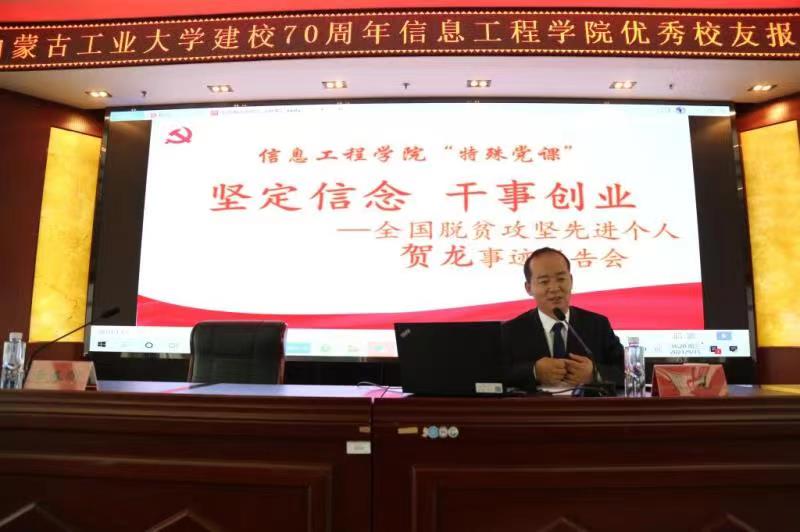 为了深入开展党史学习教育,坚定理想信念,9月15日下午,我院在金川校区电力大楼10楼报告厅举办一场“特殊党课”:坚定信念 干事创业--全国脱贫攻坚先进个人贺龙事迹报告会。
