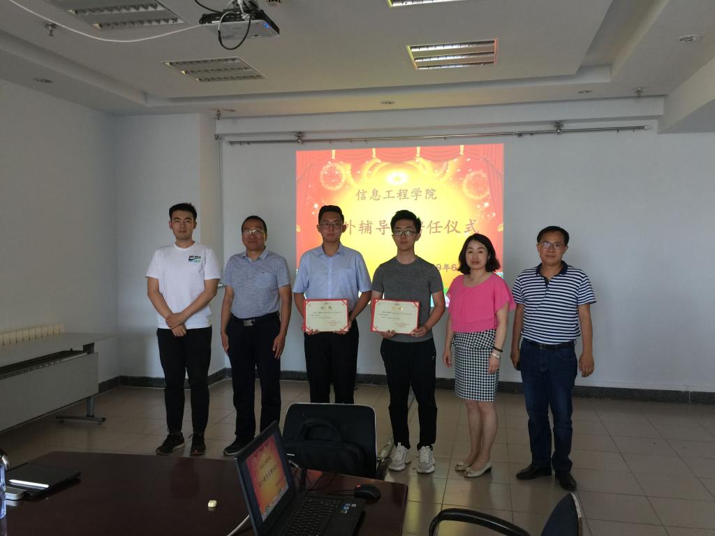 聘任仪式开始,许霞老师致开场辞,并分别介绍了翟鹤、邹逸的简历。王院长为翟鹤、邹逸颁发校外辅导员聘书并表达了对翟鹤、邹逸的欢迎,希望参会同学能以翟鹤、邹逸为榜样,学习翟鹤、邹逸兢兢业业、任劳任怨的工作热情和拼搏精神,以及心系母校、回报社会的高尚品质,在今后的道路上实现自己的梦想。