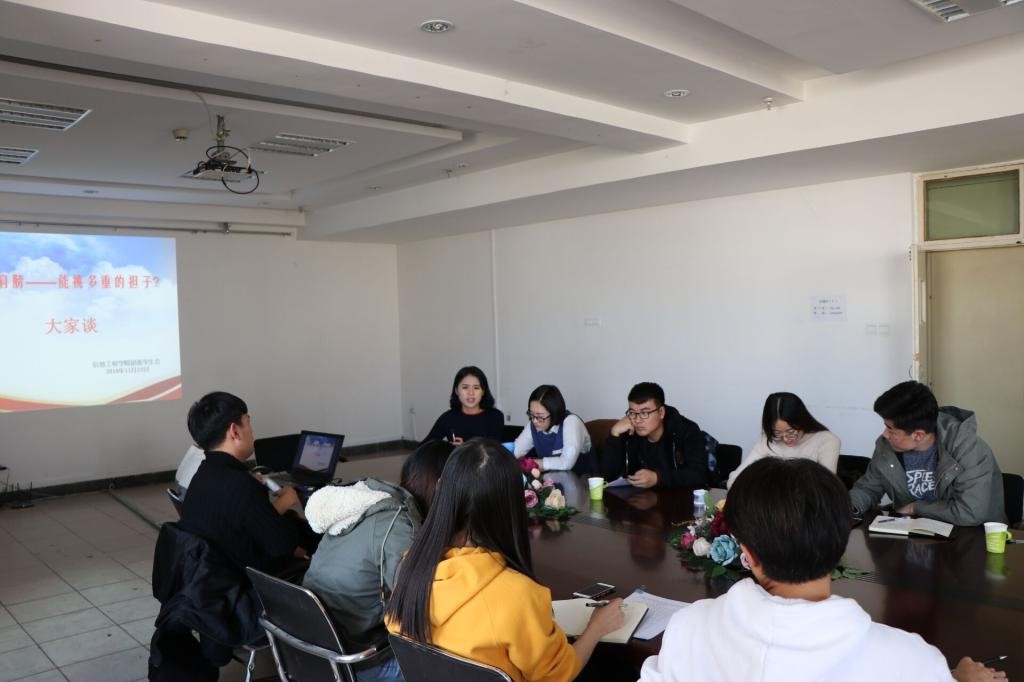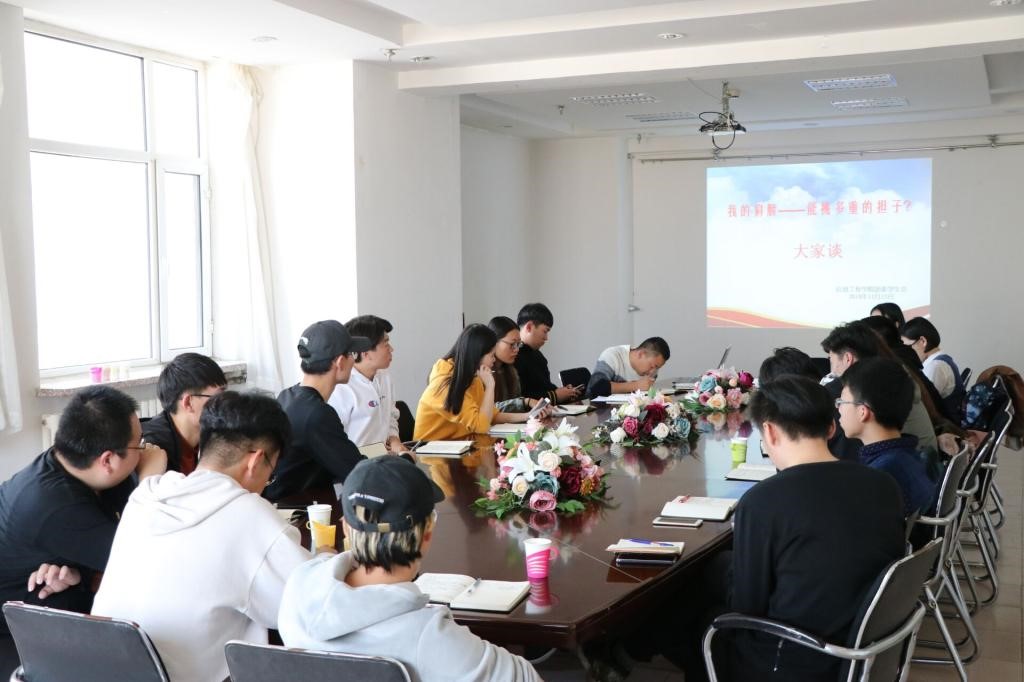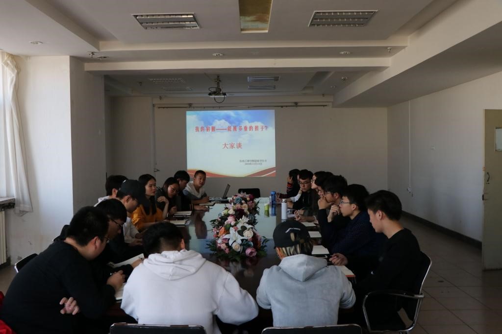 为深入贯彻落实习近平新时代中国特色社会主义思想和党的十九大精神,教育和引导广大青年学生爱国、担当、奋斗,争做担当民族复兴大任的时代新人,我院团委于11月13日中午在0918会议室召开“我的肩膀——能挑多重的担子”主题讨论会,学生会部长及以上成员参加。