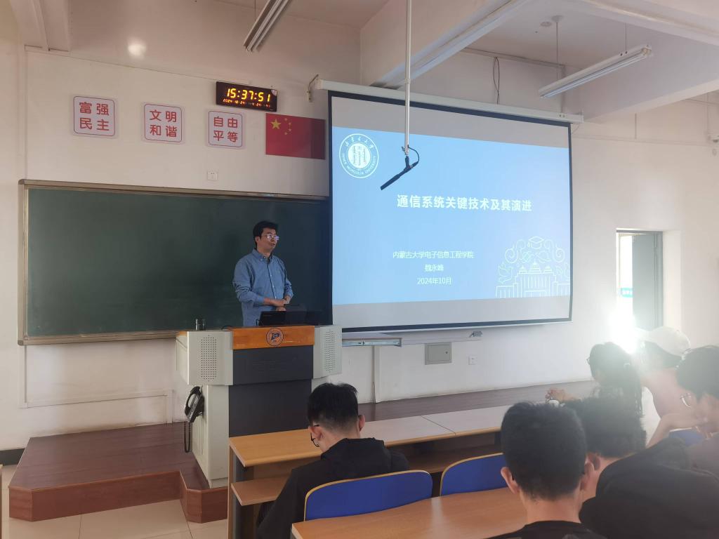 魏永峰教授作了题为“通信关键技术及其演进”的讲座。魏教授详细介绍了通信的工程科学特征,强调STEM(科学、技术、数学和工程)在通信领域的重要性,并讲解了香农信息论的核心内容,明确了信息熵的概念对通信系统演进的理论支持。在讲解中,他也提及了不同的通信方式(单工、半双工和全双工)及通信系统的类型(模拟和数字通信),他对光纤通信和移动通信的特点的生动描述,让同学们对未来的通信技术发展充满期待。