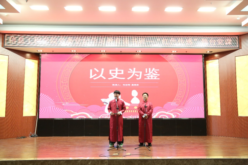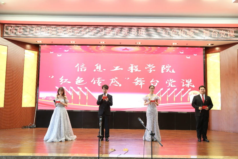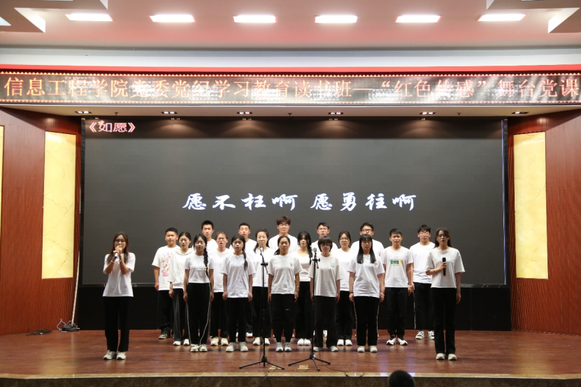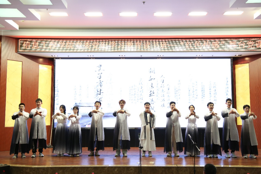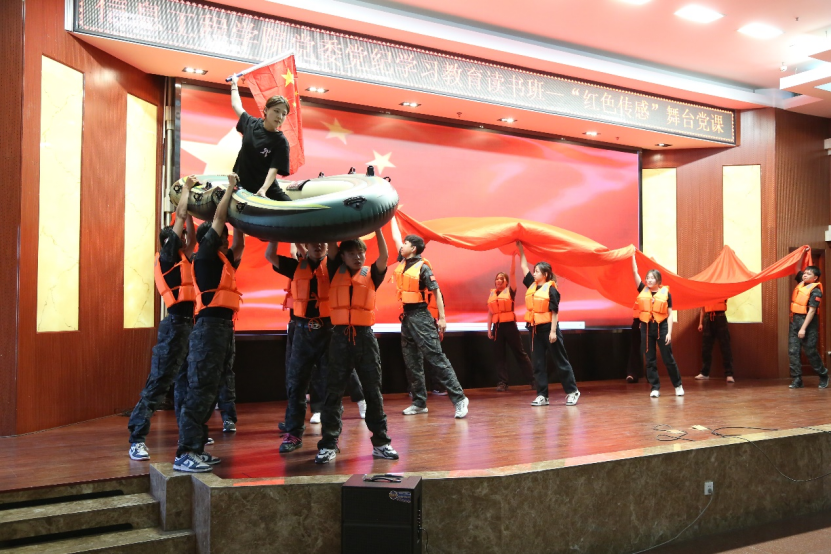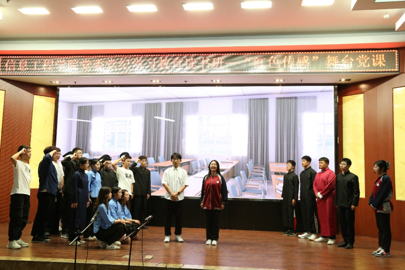 此次舞台党课以深入推进党纪学习教育为主线,通过情景剧、舞蹈、相声、朗诵、合唱等多种艺术形式,把党纪学习教育融入舞台艺术,把党课从“讲台”搬到“舞台”。在情景剧中把李大钊、陈独秀、红军等历史人物搬上舞台,带领师生穿越历史的长河,重温共产党员为了新中国而奋斗的时代;在歌舞中感受新时代下国家的富强、文化的繁荣;在相声中以史为鉴,跟随表演者的话语,回顾历史、学习历史;在诗歌朗诵中,歌颂伟大的中国共产党,厚植爱国主义情怀。
