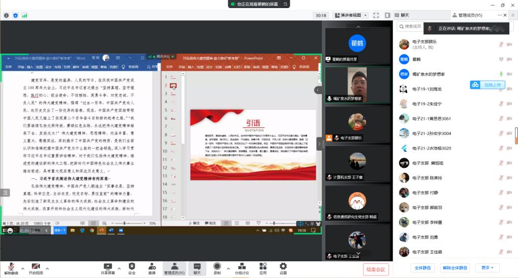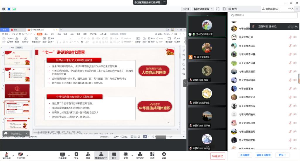 学院党委委员、行政支部书记许霞对大学生入党知识进行了讲解普及;党委书记王彩玲组织大家认真学习贯彻习近平总书记“七一”重要讲话精神;党委副书记、副院长王金彪组织大家对党的十九届六中全会精神这一课题进行深入讨论交流;校外辅导员翟鹤重点给大家讲了弘扬伟大建党精神,奋力答好“新考卷”;院长李春明对“深刻把握五个必由之路”这一话题引导大家展开讨论、学习。