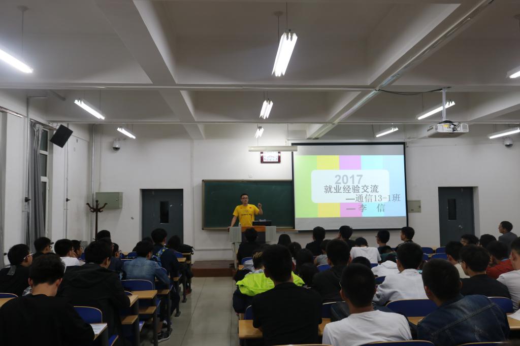 会上,通信工程13-2班郭慧,软件工程13-2班翟娜,网络工程13班包世光及通信工程13-1班李信四位同学就考研备战、保研选择、公务员应考及就业、择业经验等四个方面为学弟学妹们讲述了自己的经历,分享了自己的经验,并鼓励他们大四这一年一定要端正态度,调整好心态,信心满满的去迎接挑战,碰到困难一定要多争取、多询问、多借鉴、多付出,大胆尝试,挑战自我,赢得一个美好的明天。