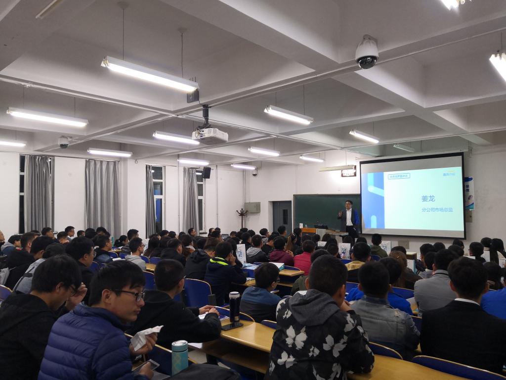 姜总监为同学们讲述了公司17年以来的成长历史及海康威视“未来视界”的公司发展战略,深入浅出的为学生们讲解了“AI”、“CLOUD”、“BIG DATA”等公司前端发展技术丰富了同学们的视野,启发了同学们的思维,赢得了同学们的阵阵掌声。李经理为同学们介绍了海康的企业精神,用人准则,以及公司的竞争发展机制,结合自己的求职经历为同学们分析了毕业生第一份工作的重要性,阐明了选择的重要性。校友朱达为师弟师妹们讲述了自己毕业以来的职场经历,分享了自己的求职及工作心得,使同学们更加全面的了解了公司的人文氛围以及积极向上的工作气氛