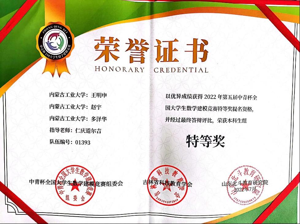 2022年第五届中青杯全国大学生数学建模竞赛特等奖答辩评审于7月26日结束,最终经过组委会评审,我院学生获得全国本科组唯一特等奖的好成绩。